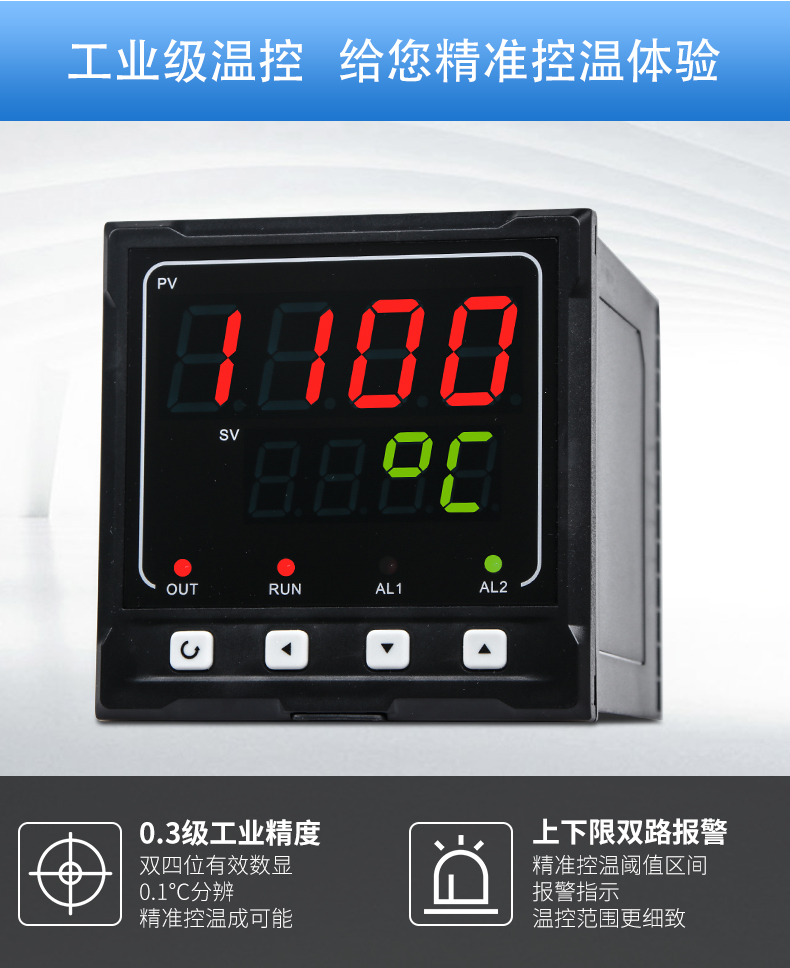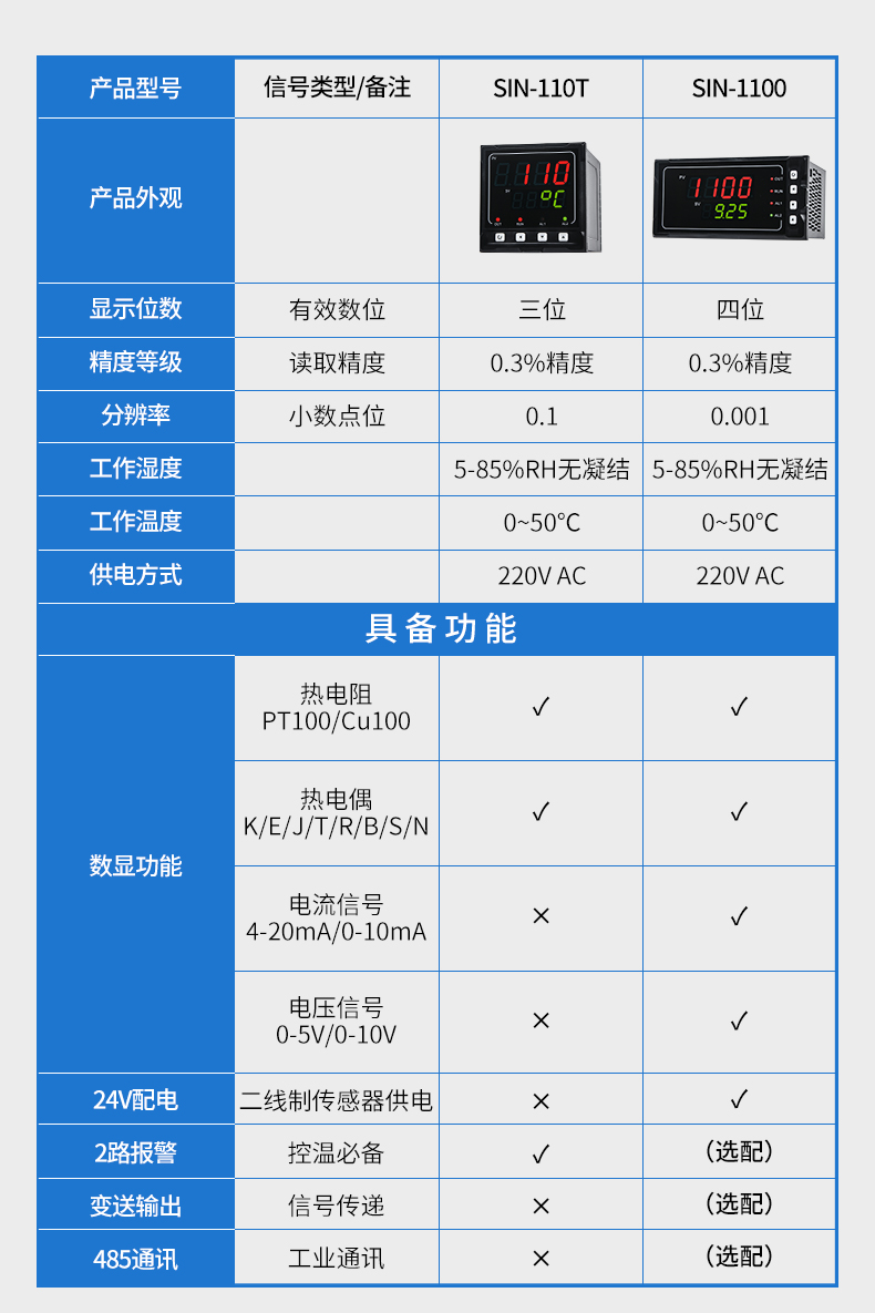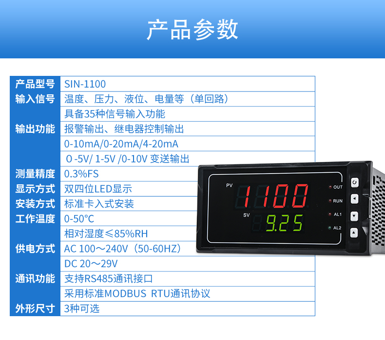 聯測SIN-1100數顯表(簡易型),傻瓜式操作,0.3級測量精度,7款外型尺寸,雙四位LED顯示,可支持熱電偶、熱電阻、電壓(可開方運算)、電流(可開方運算)及變送器輸入,適用溫度、壓力、流量、液位、濕度等工業過程量的監測。CN2